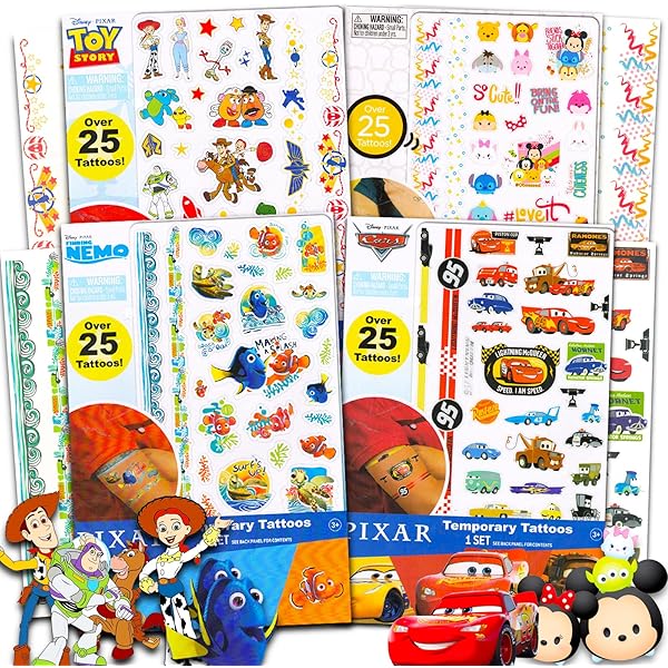 Amazon Com Pixar Disney Party Supplies For Kids 100 Temporary Tattoos Party Favors Featuring Tsum Tsum Finding Nemo Disney Cars And Toy Story Toys Games
